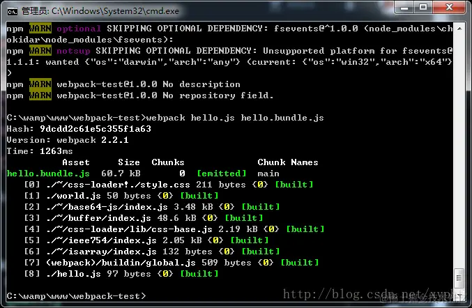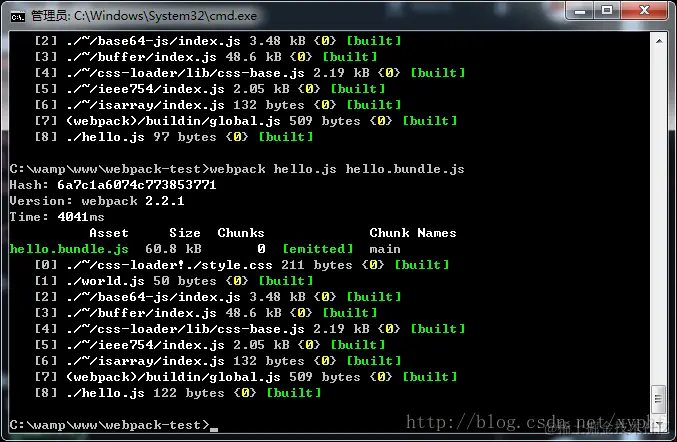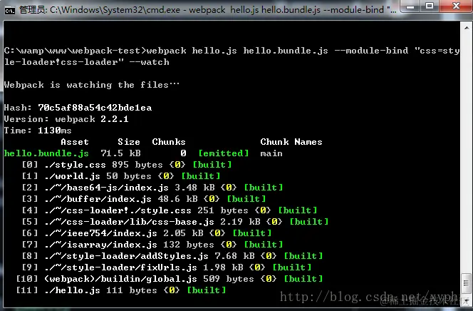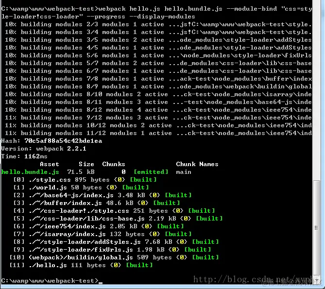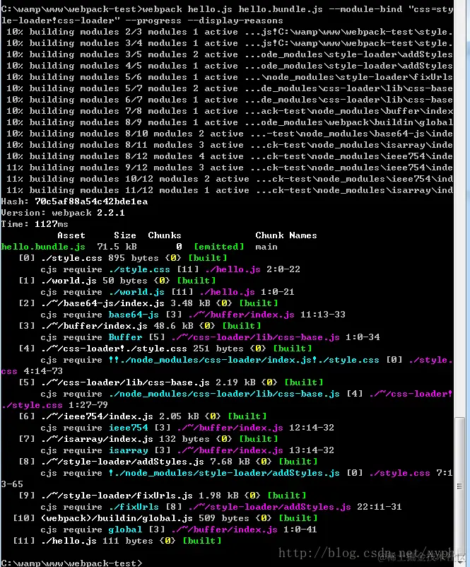 webpack hello.js hello.bundle.js --module-bind "css=style-loader!css-loader" --progress --display-modules --display-reasons --watch