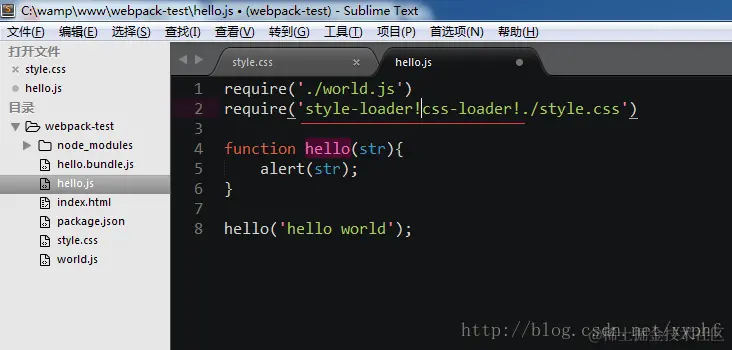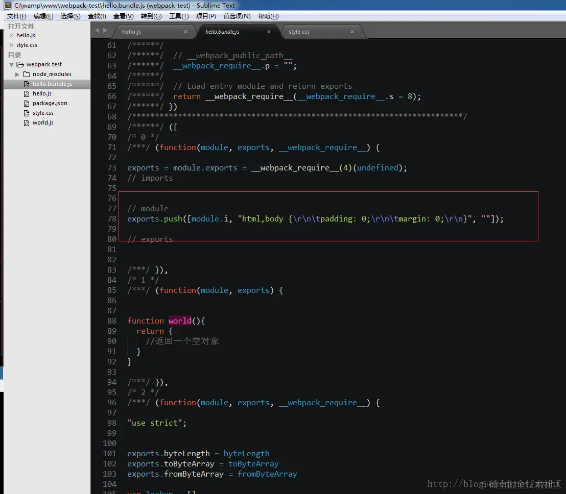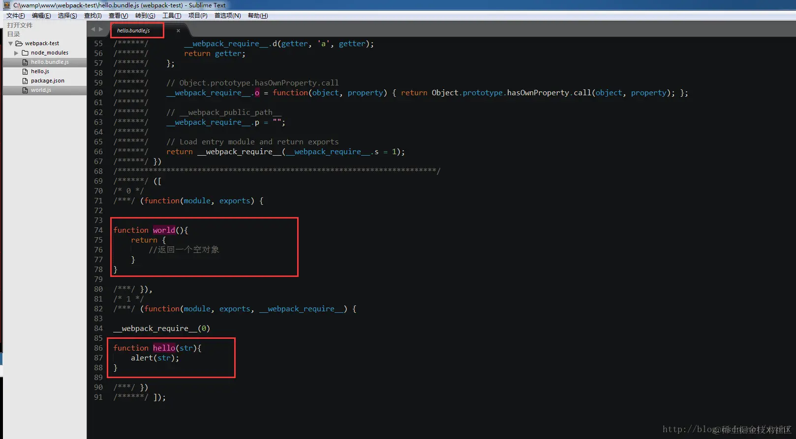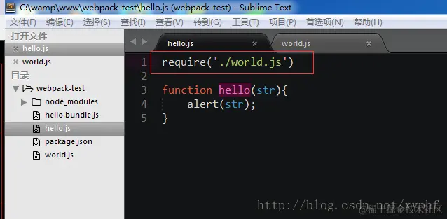四、我们再写一个world.js文件,然后让hello.js这个文件去引用这个文件,通过这个方式,我们来了解一下webpack的工作原理
