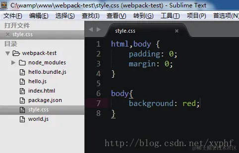 这时候发现背景变为红色,样式生效了,所以require(‘style-loader!css-loader!./style.css’)里面的style-loader!css-loader!千万不能省略或漏写。