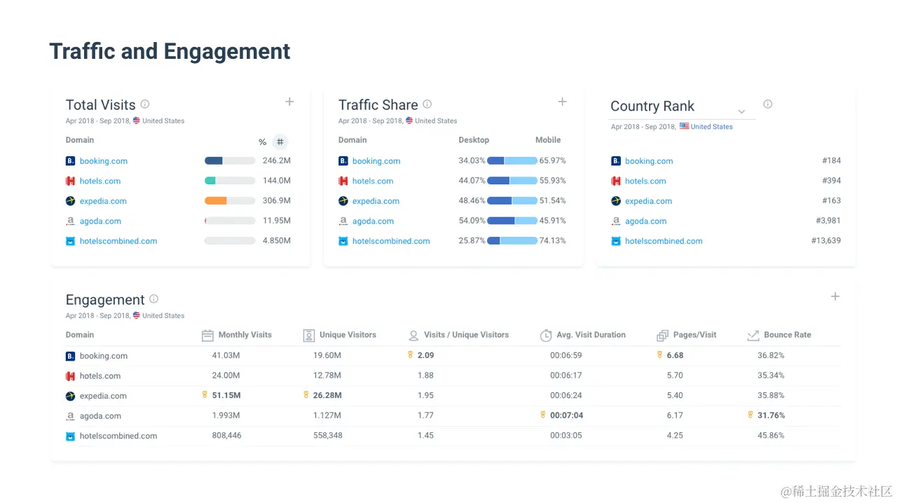 你可以追踪各种指标,如每日页面访问量、搜索流量来源、访问持续时间、每次访问的页面数量和跳出率。无论你是想优化你的SEO策略还是发现新的合作机会,Similarweb都是你的不二之选。