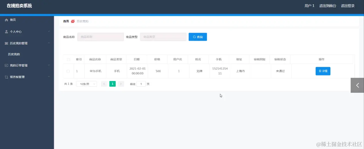 历史竞拍管理,在历史竞拍管理页面可以查看商品名称;商品类型、日期、价格、用户名、姓名、手机、地址、审核回复、审核状态、审核等内容,并可根据需要对历史竞拍管理进行详情,修改,删除或详细内容等操作,如图5-9所示。