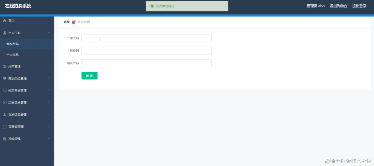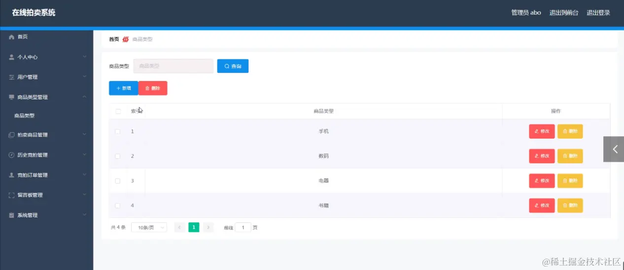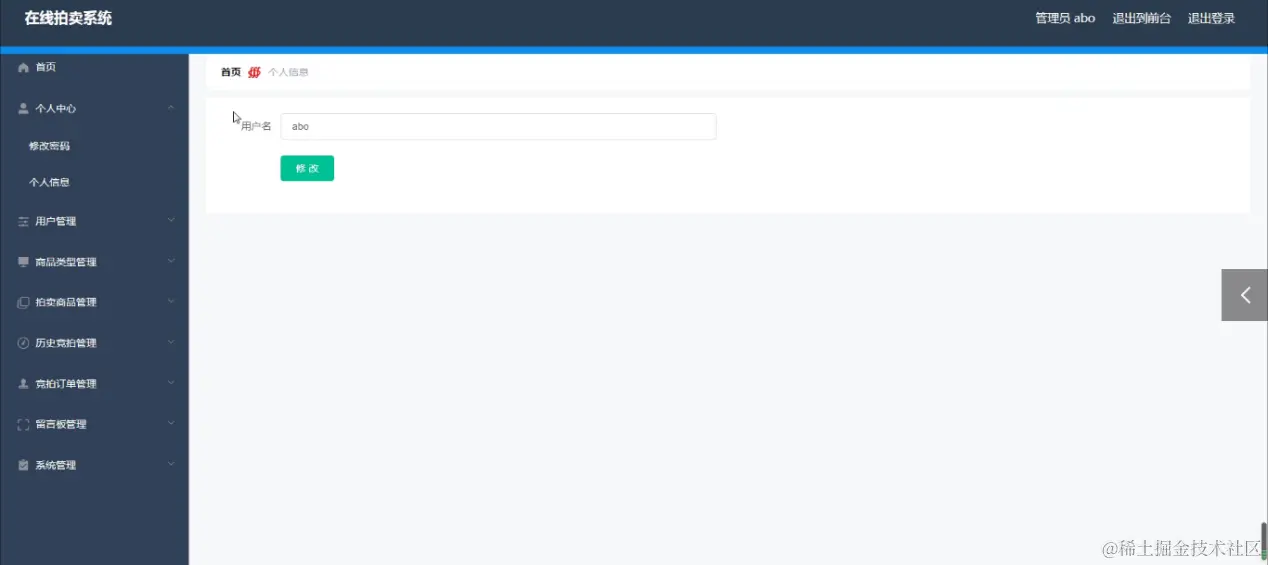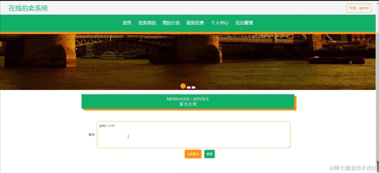 随着社会的发展,社会的各行各业都在利用信息化时代的优势。计算机的优势和普及使得各种信息系统的开发成为必需。 在线拍卖系统,主要的模块包括管理员;首页、个人中心、用户管理、商品类型管理、拍卖商品管理、历史竞拍管理、竞拍订单管理、留言板管理、系统管理,用户;首页、个人中心、历史竞拍管理、竞拍订单管理、留言板管理,前台首页;首页、拍卖商品、竞拍公告、留言反馈、个人中心、后台管理等功能。系统中管理员主要是为了安全有效地存储和管理各类信息,还可以对系统进行管理与更新维护等操作,并且对后台有相应的操作权限。 要想实现在线拍卖系统的各项功能,需要后台数据库的大力支持。管理员验证注册信息,收集的用户信息,并由此分析得出的关联信息等大量的数据都由数据库管理。本文中数据库服务器端采用了Mysql作为后台数据库,使Web与数据库紧密联系起来。在设计过程中,充分保证了系统代码的良好可读性、实用性、易扩展性、通用性、便于后期维护、操作方便以及页面简洁等特点。 本系统的开发使获取在线拍卖系统信息能够更加方便快捷,同时也使在线拍卖系统信息变的更加系统化、有序化。系统界面较友好,易于操作。 **关键词:**在线拍卖系统 ;Spring Boot框架;Mysql数据库