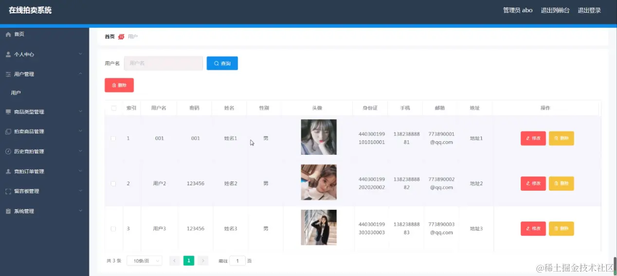 用户管理,在用户管理页面可以填写用户名、密码、姓名、性别、头像、身份证、手机、邮箱、地址等内容,并可根据需要对用户管理进行,修改或删除等操作,如图5-4所示。