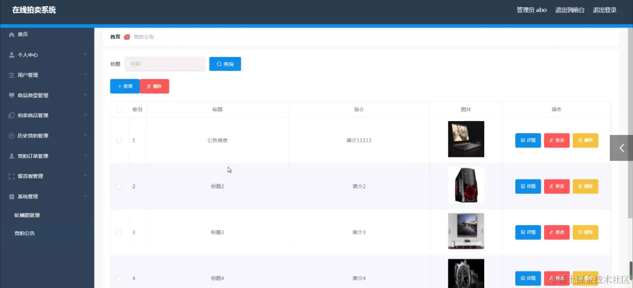 竞拍公告 ,在竞拍公告页面可以查看标题、简介、图片等内容,并可根据需要对竞拍公告进行详情,修改,删除或详细内容等操作,如图5-7所示。