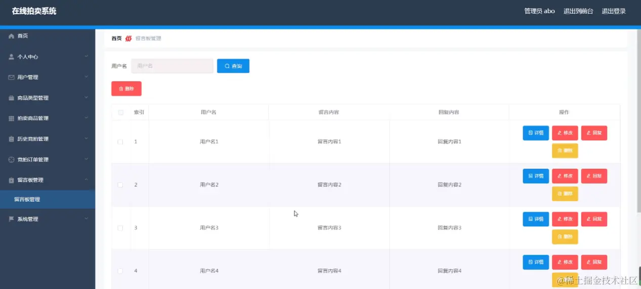 留言板管理,在留言板管理页面可以查看用户名、留言内容、回复内容等内容,并可根据需要对留言板管理进行详情,修改,删除或详细内容等操作,如图5-11所示。