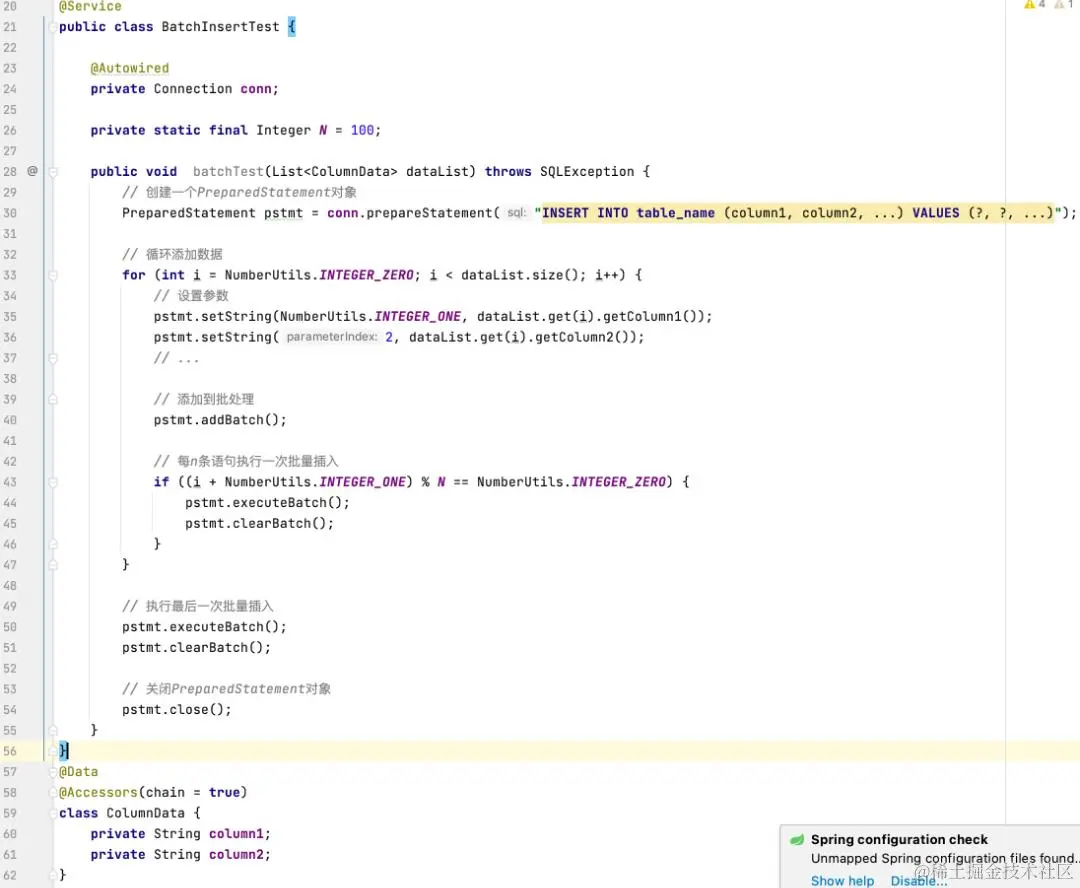通过使用批量插入,我们可以将多条数据打包发送给数据库,而不是逐条发送,从而大幅提高插入效率。
