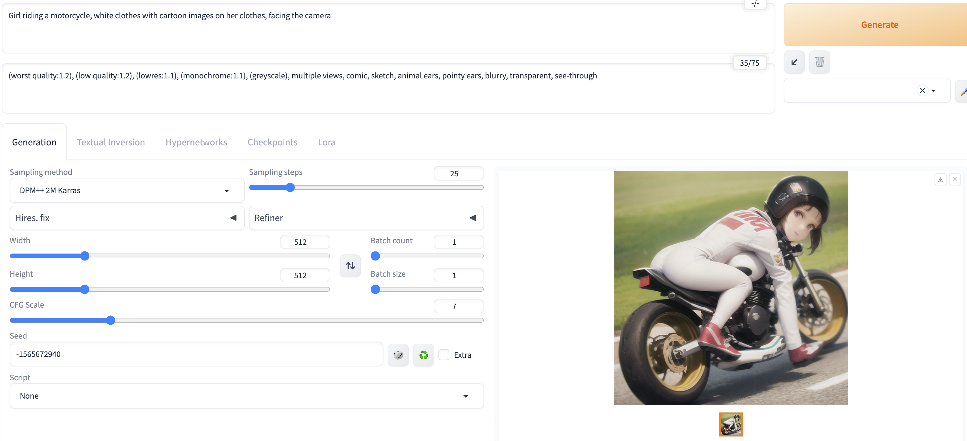 Stable Diffusion checkpoint:选择具体的模型Prompt:正向提示词,描述你想要的图片,比如:girl,long hair,black clothes,big eyes(长发黑衣服大眼睛的女孩)。@注意:不支持中文Negative prompt:反向提示次,不想要在图像中出现的词,比如:low quality(低质量)。Sampling Method:抽样法,常用于去噪,内置多种算法可供选择。比如DPM++ 2M Karras,可以很好地平衡了速度和质量。Sampling Steps: 采样步骤数。虽然越多越好,但是值越大生成的时间越长。大部分情况选择:20 ~ 25。Width & Height:输出图像的大小长和宽。长宽也不是随意设置;目前使用 v1 模型时,至少将一变设置为512。目前已知可选的组合有:512*512、512*768、768*512Batch Count: 批次数量。Batch size:每一批次要生成的图像数量。CFG scale: 用于控制模型生成的图片,和提示词的符合度。默认为7,数值越小AI自由发挥的空间就越大,数值越大相对来说就越刻板(严格按照提示词);Seed:指定一个随机种子,用于初始化图像生成过程。相同的种子值每次都会产生相同的图像集,这对于再现性和一致性很有用,如果将值设置为-1,则每次运行都会生成一个随机种子。Hires.Fix: 高清修复,主要是提高生成的图像的分辨率,注意:开启后生成图片会很慢;其他选项说明:Upscaler:指的是放大算法,内置了很多算法,其中R-ESRGAN 4x+:擅长写实图片、R-ESRGAN 4x+ Anime6B:擅长二次元图片,Hires setps:高清修复的步数和Sampling Steps代表的意义一样;Denoising strength: 重绘幅度,AI的自由发挥空间,值越大AI就越放飞自我,值越小就越按照原图重绘;Upscale by: 放大的倍数,和下面两个互斥;Resize width to:指的是把图片放大后,宽度的像素;Resize height to: 指的是把图片放大后,高度的像素;