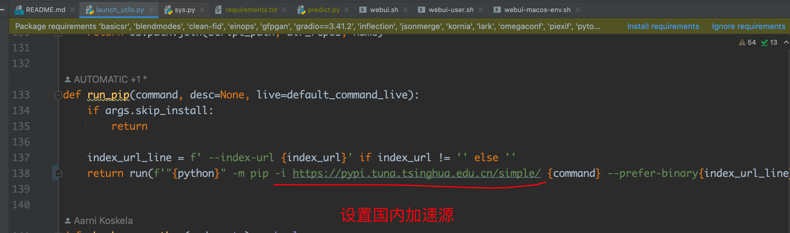 这里比较奇怪的是,生成的命令用的python3不是我本地的环境,它自己在项目里又创建了一个,然后就变成了/Users/liuqh/ProjectItem/AiItem/stable-diffusion-webui/venv/bin/python3,我这边的解决方法是,找到 stable-diffusion-webui/modules/launch_utils.py文件在138行,加上-i https://mirrors.aliyun.com/pypi/simple