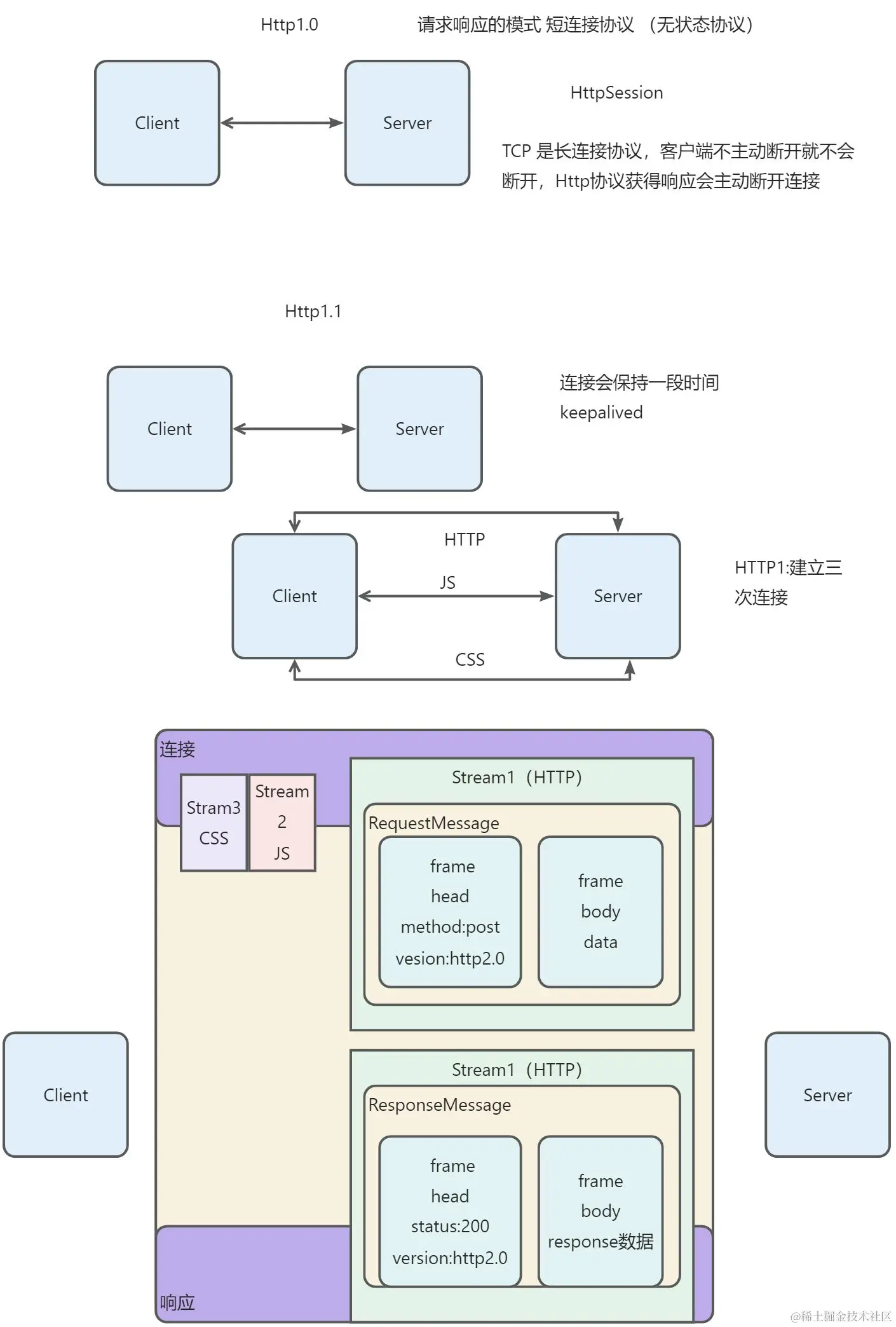 Http1.0: 请求响应的模式 短连接协议 (无状态协议) 传输数据文本结构 单工 无法实现服务端推送