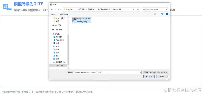 如果模型文件包含有附属文件(如材质贴图),则需要将文件同时上传。上传方式:点击【上传文件】,在文件选择框中,按住键盘上的【Shift】键,通过鼠标左键同时选择多份文件,进行文件上传。