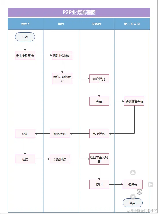 泳道图,顾名思义,是流程图的一种,其中对职能的划分像游泳池泳道相类似比拟而来。用于可视化展示跨部门或跨角色的工作流程和协作。 它将不同的部门或角色表示为不同的“泳道”,并在每个泳道中显示相应的任务、活动或流程。 通过泳道图,可以清晰地了解每个部门或角色的职责和工作流程,以及它们之间的协作关系。