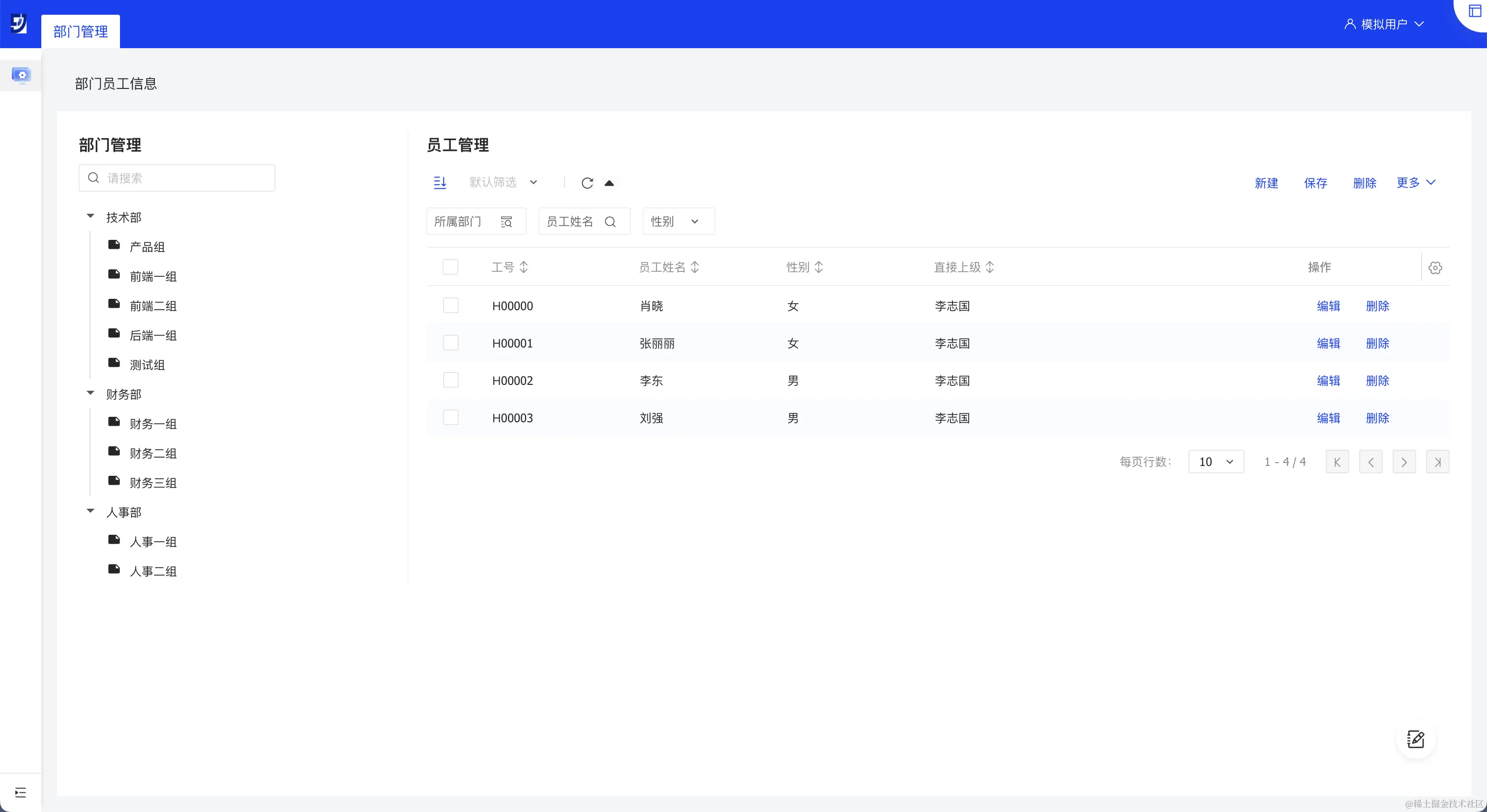 左树右表模板适用于数据源为头行结构的表,头表为树结构,行表则以列表的形式展示数据,比如部门-员工管理,左侧显示为组织架构树,点击某一部门,即可将该部门下的员工信息显示在右侧的员工管理列表中。