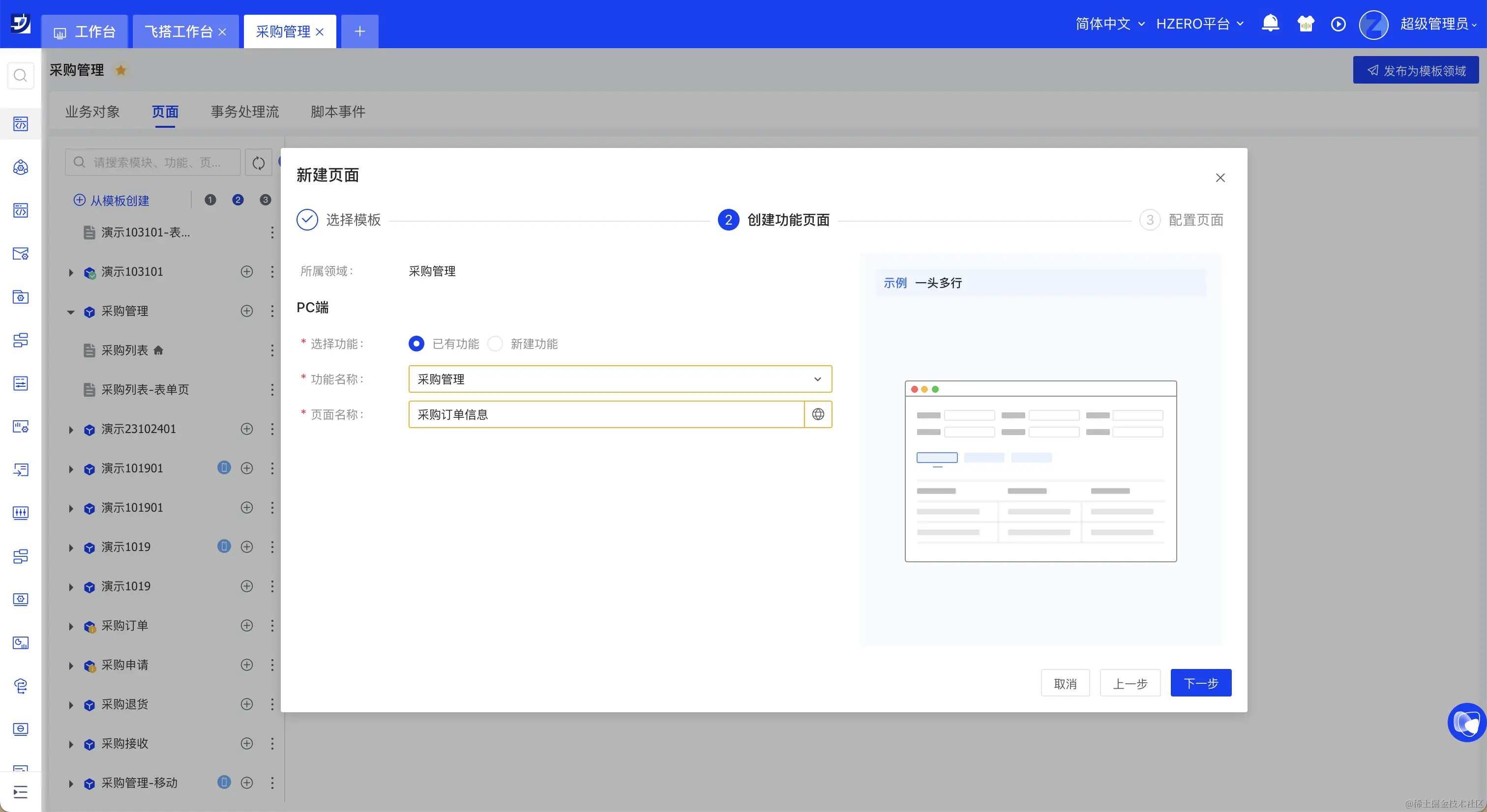 ● 快速创建页面能力: 通过引导页面,简单几步即可快速完成功能可用页面的创建