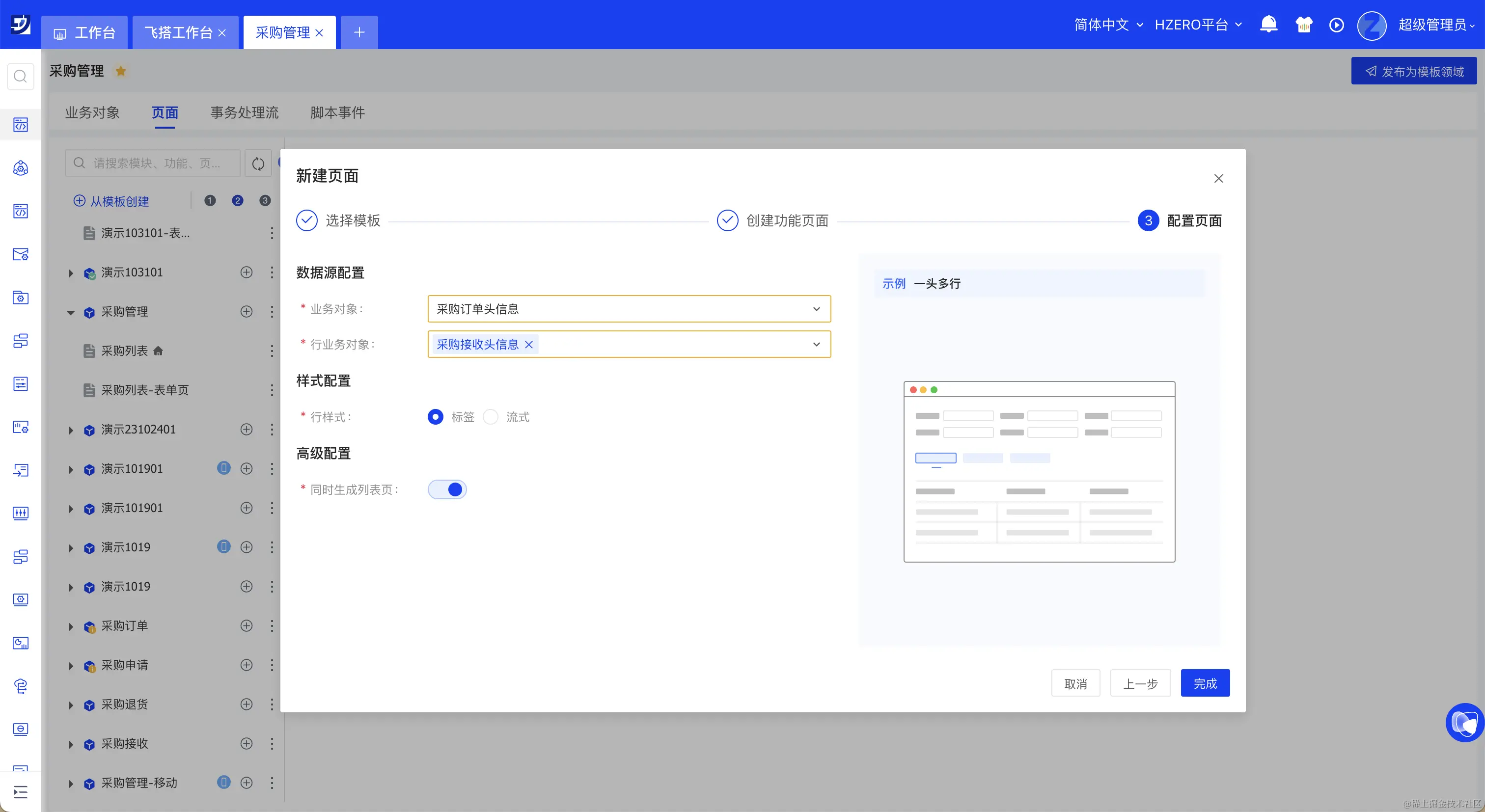 在完成了页面模板的选择、页面基本信息的定义后,为当前页面定义数据源,并支持定义当前模板页面关联的页面****,比如在选择了一头多行模板后,可选择同时生成头数据的列表页,生成后即可通过头数据的列表页跳转至一头多行的新建页、编辑页及详情页,同时也支持配置行列表样式是标签还是流式。