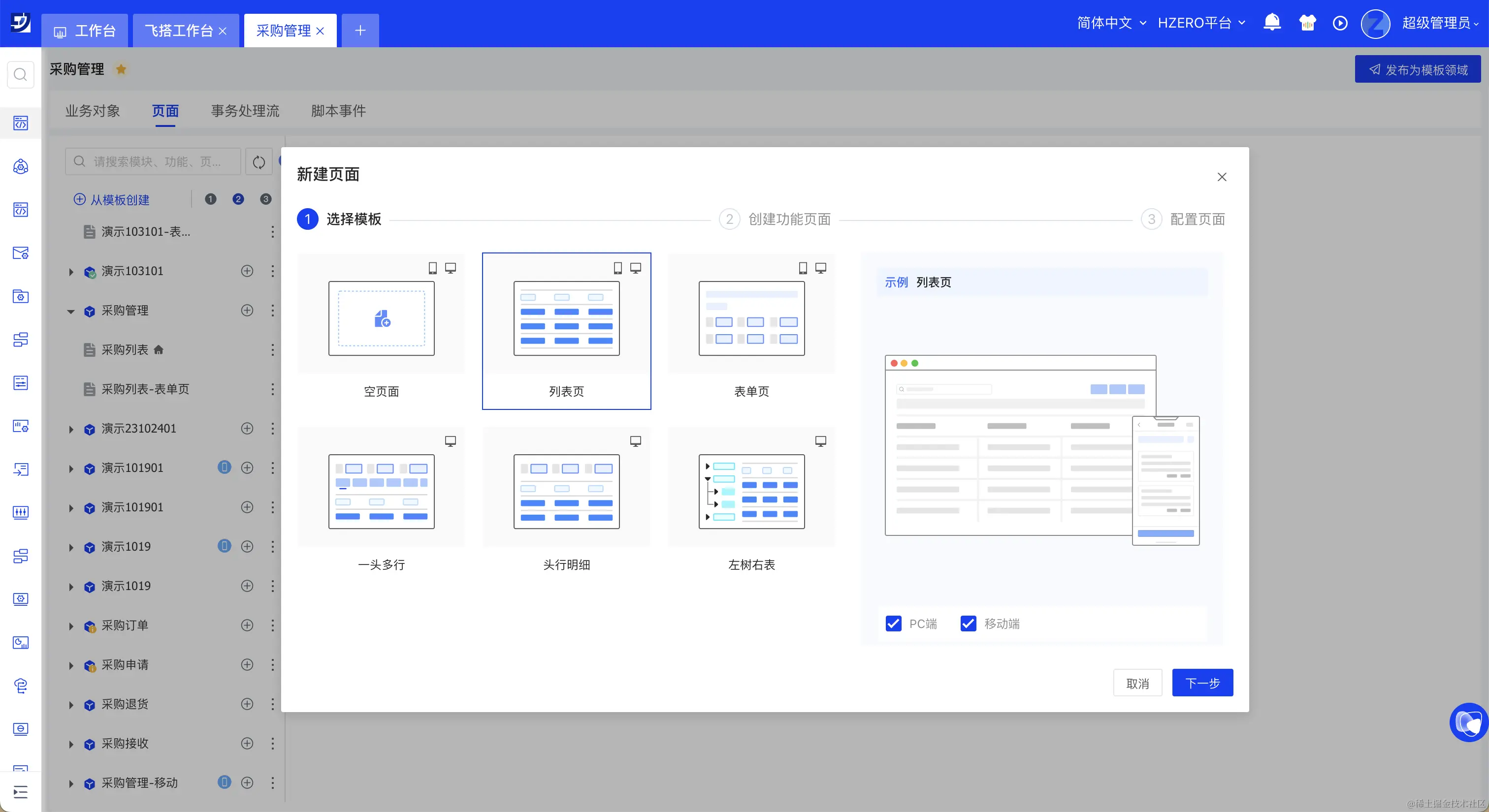 飞搭预置了较丰富的页面模板:PC端预置了列表页、表单页、一头多行、左树右表等模板,移动端预置了列表页、表单页模板。您可选择适合即将搭建的功能的模板,比如搭建采购订单(头行结构)页面,可选择一头多行模板;搭建部门对应的员工信息的页面,可选择左树右表模板。
