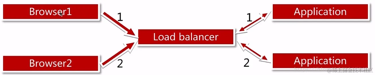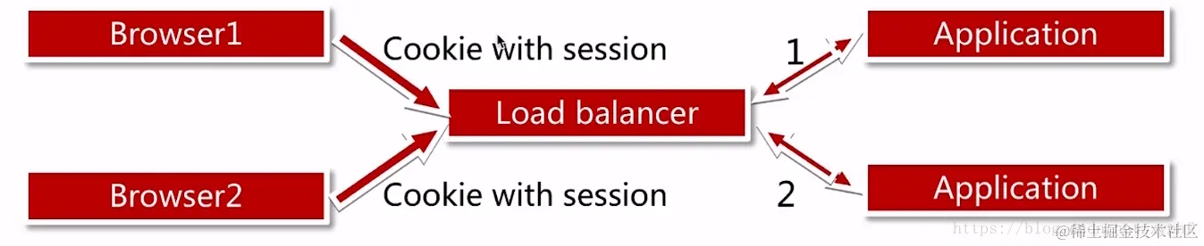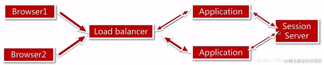 这样的请求路径就是Browser1通过负载均衡服务器请求到Application1当中,然后它把Browser1的Session信息存到Session Server当中;当想获取Session的时候,应用就从Session服务器当中获取Session;我们所以用户的Session信息都统一保存到Session Server当中;