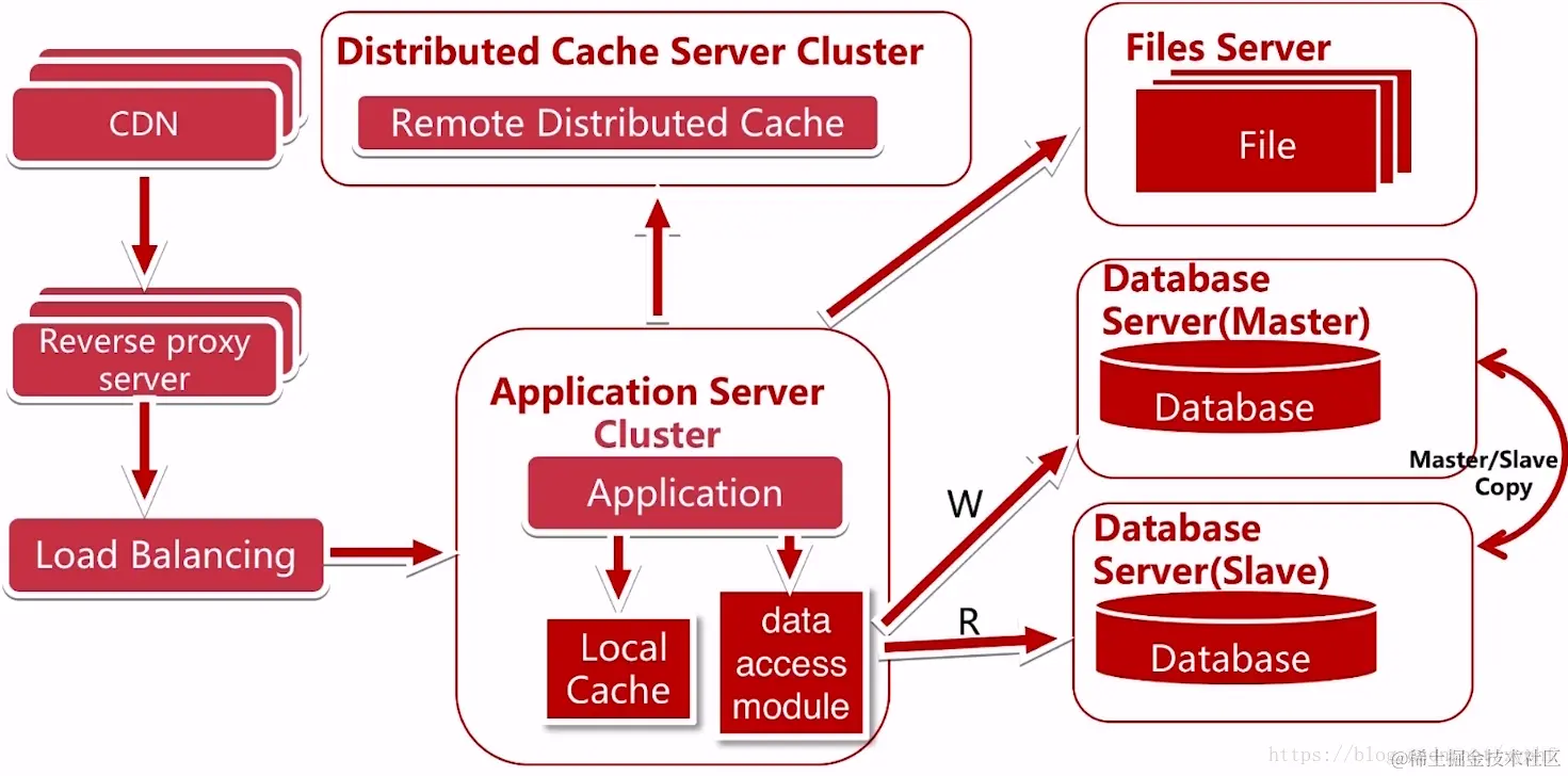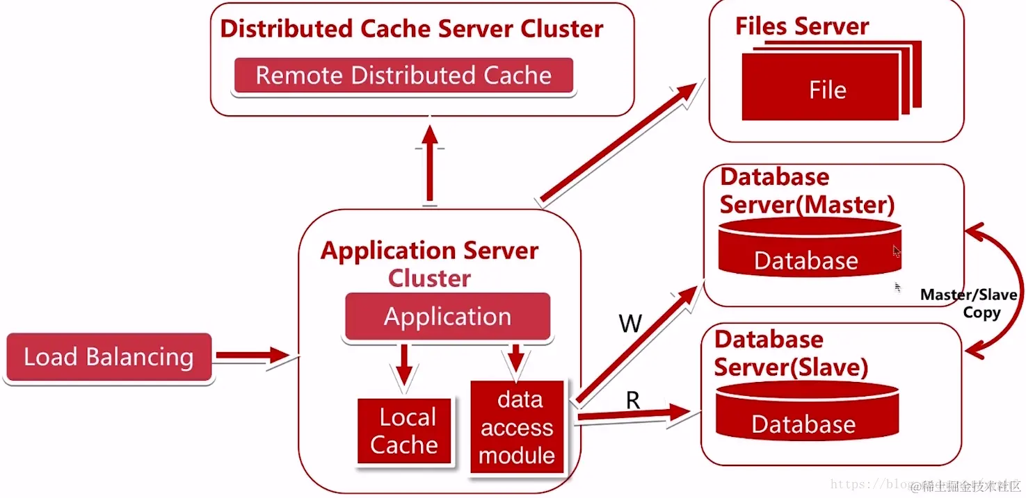 假设我们使用的Application Server是tomcat,那么tomcat就会成为一个瓶颈,虽然我们可以通过购买更强大的硬件,但是总会有上线,并且这个成本到后期是一个指数级的增长。