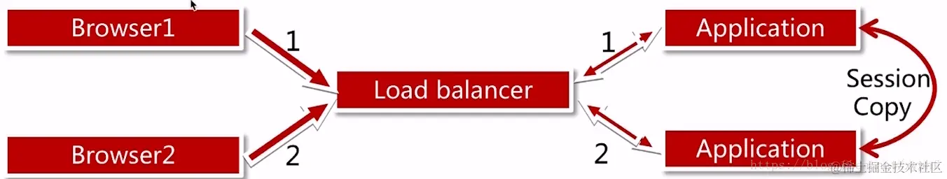 也就是说Browser1通过负载均衡服务器访问到1这个Application当中的时候,会把这个用户的Session复制到第二个用户的服务器上;也就是说这两个服务器都保留着Browser1的Session信息;