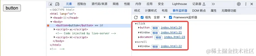 调试栏“元素”下选中当前按钮的标签,右侧“事件监听器”就会列出它能触发的全部事件,以及事件的代码位置。这就能快速定位到“Bug事件”的来源。