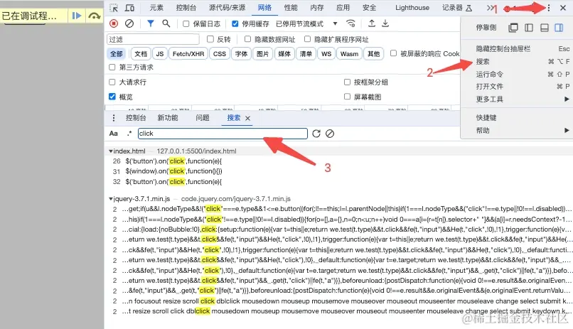 我只知道自己定义的函数名,怎样断点调试它?“网络”下的搜索可以对加载的文件进行全局搜索;输入你的函数名,回车下就能找到(只希望名字不要太普通)。