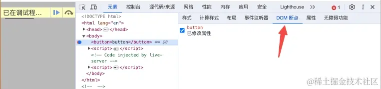 如何找到代码来源呢?鼠标右键在按钮标签上,可以在菜单的“发生中断条件”下找到“DOM断点触发条件”: