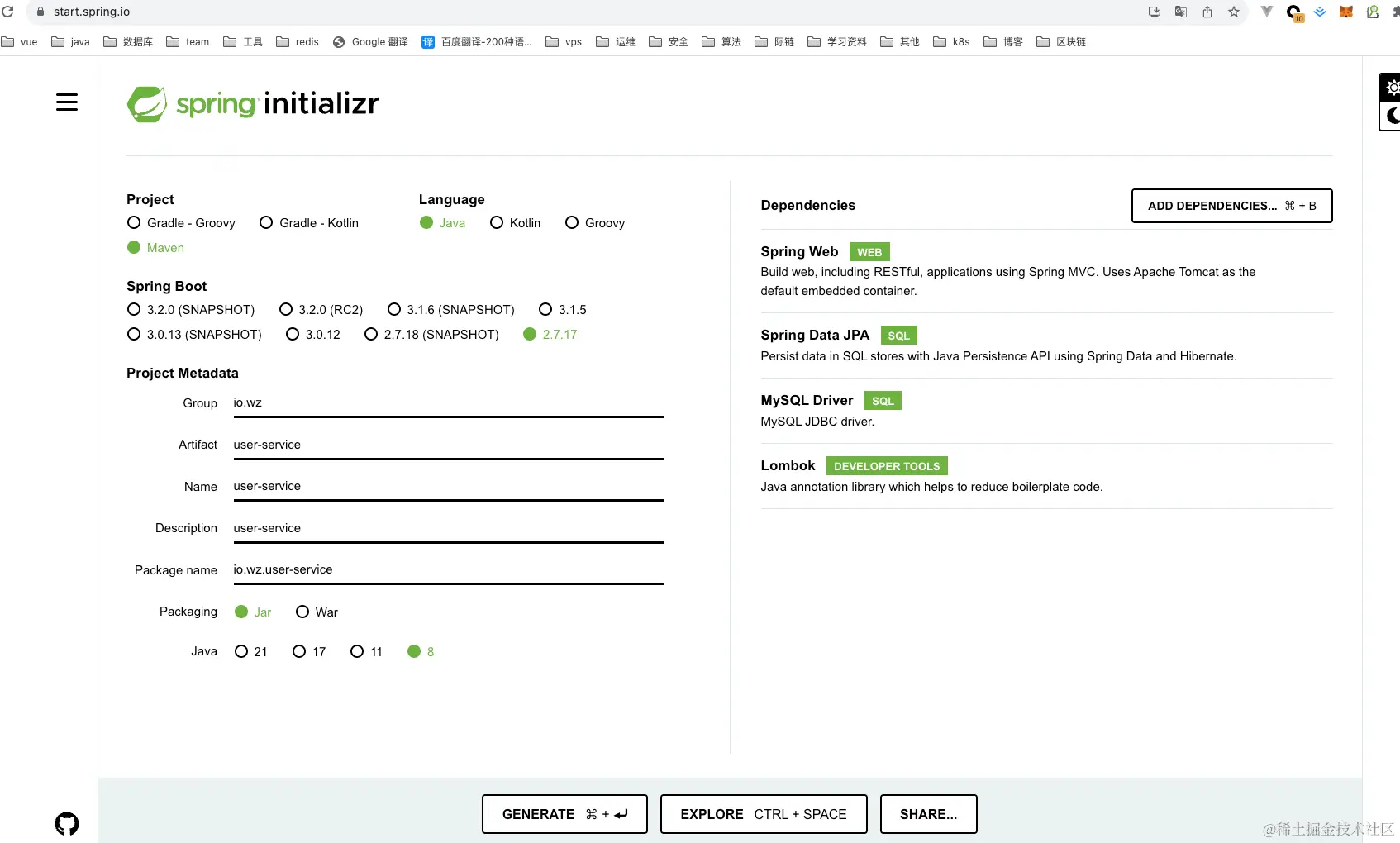 点击“GENERATE”按钮以 zip 文件形式下载 Spring boot 项目。解压zip文件并在IntelliJ IDEA中导入Spring boot项目。 pom.xml文件供参考: