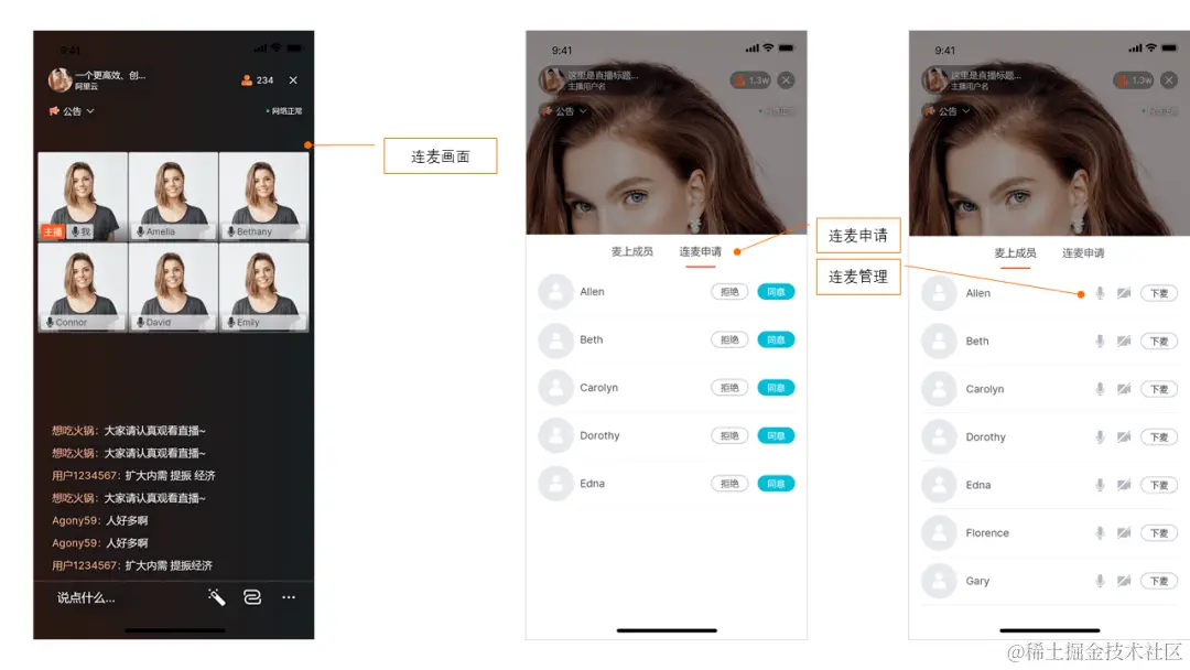 连麦PK:互动直播AUI Kit方案支持主播与观众的连麦互动,调动直播间气氛,支持连麦PK、多人互动等直播能力,同时也支持对连麦/PK用户的状态进行管理。