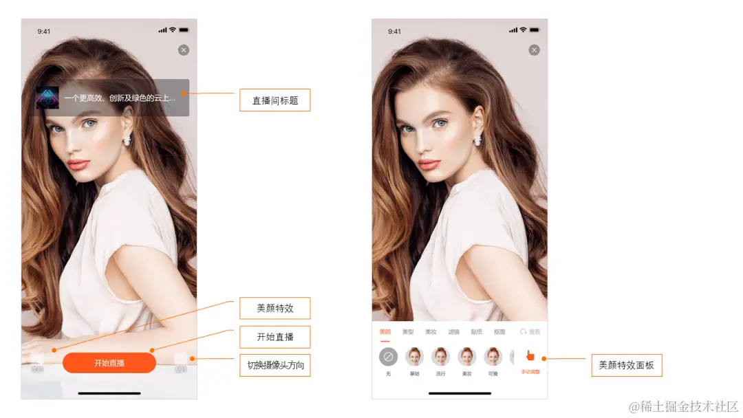 美颜特效:互动直播AUI Kit支持基础美颜功能,主播可以按照直播需求,自行设置美白、磨皮、锐化、红润等效果,轻松打造百万粉丝“颜值主播”。