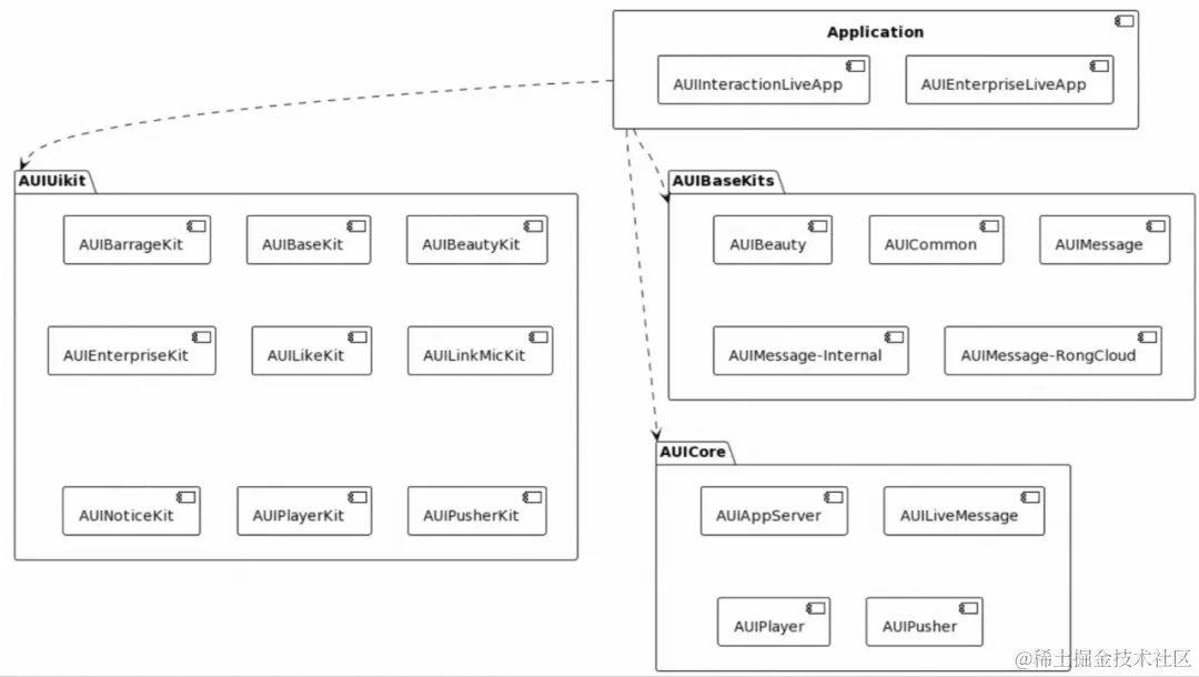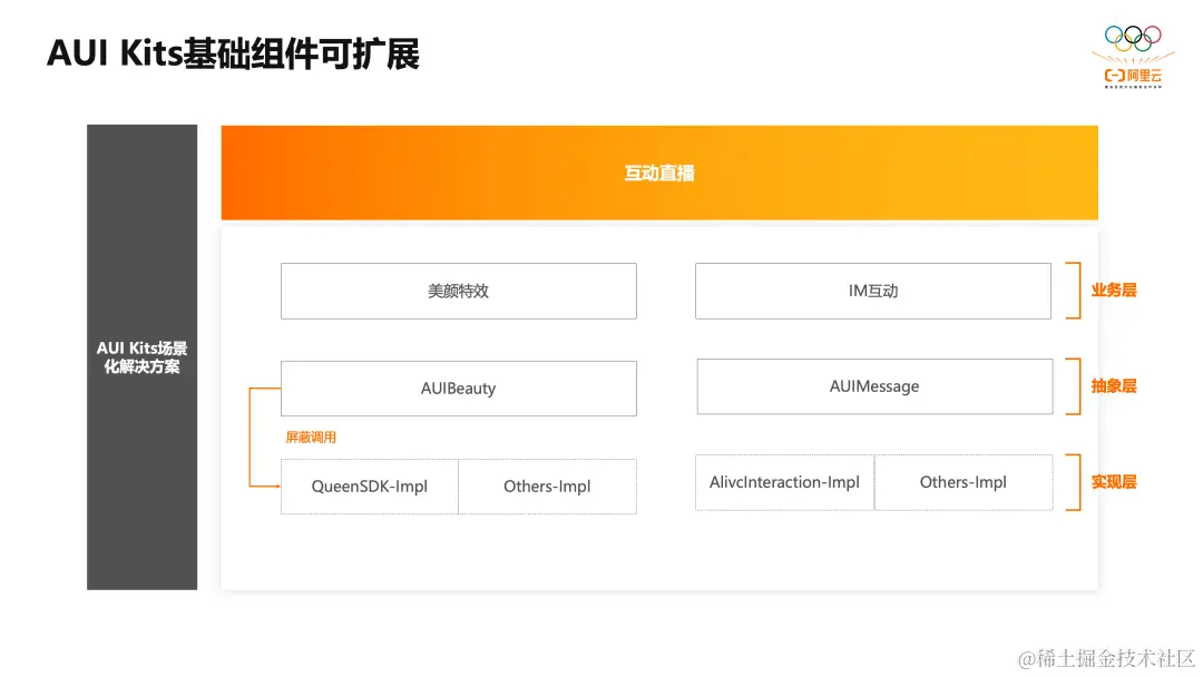 为了保证互动直播AUI Kit基础组件的灵活性、可扩展性,我们针对基础组件,定义了抽象化接口,在提供一套标准实现方案的同时,也把可选择权交给用户。用户可按照自身需求,选择其它原子能力的SDK作为解决方案,来实现自身的业务需求,这样也最大程度保证了用户在二次开发时的灵活可控,真正做到“高内聚、低耦合”。