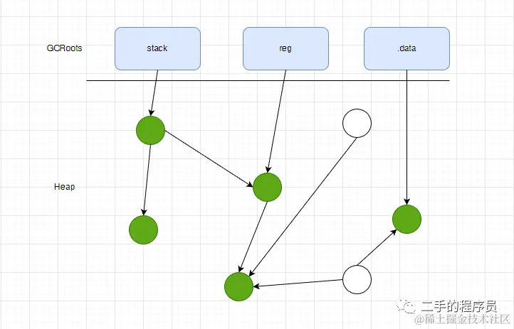 有一些指针是赋值器可以直接访问的,我们称之为 GCRoots。GCRoot 指向堆区的对象,借助GCRoots 我们可以访问整个堆区分配的对象。