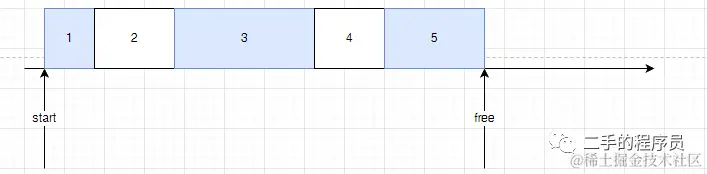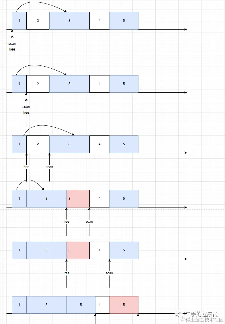 算法很简单,就是使用2个指针,一个指针 free 指向空闲位置,一个指针 scan 指向存活的对象。有点类似 leetcode 里面的一个题目,就是在一次遍历中去除数组中的重复元素。