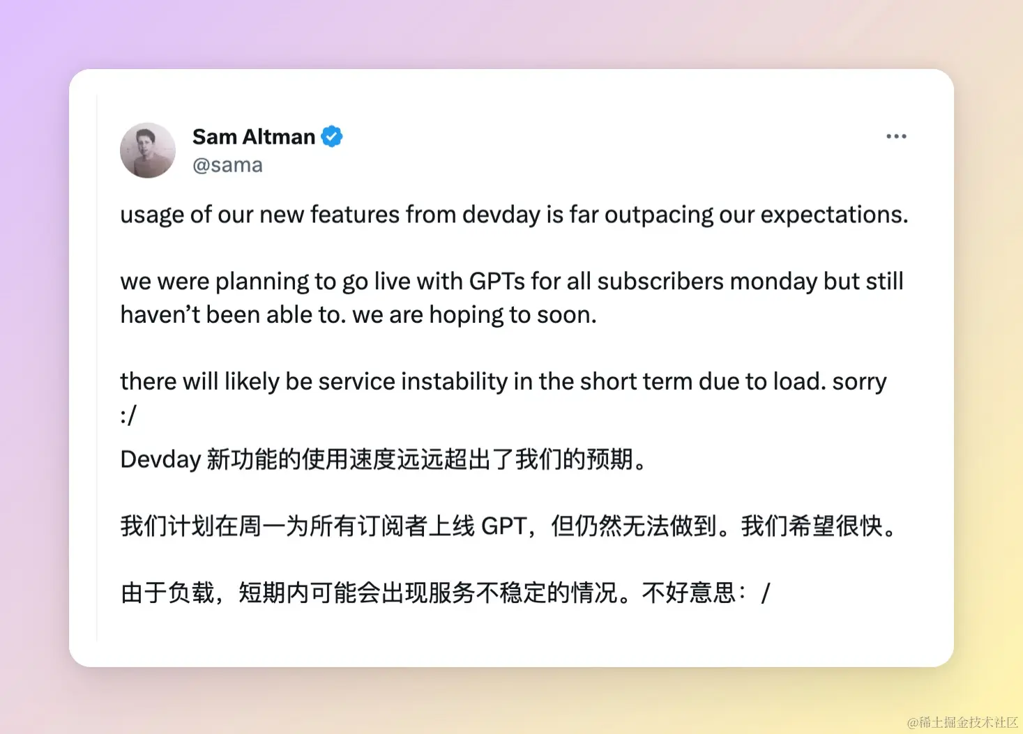Sam Altman 为此也在推特上发了道歉信, 我想说可否给我自动续半个月的 ChatGPT Plus, 10天也行, 我不怪你, 😏.