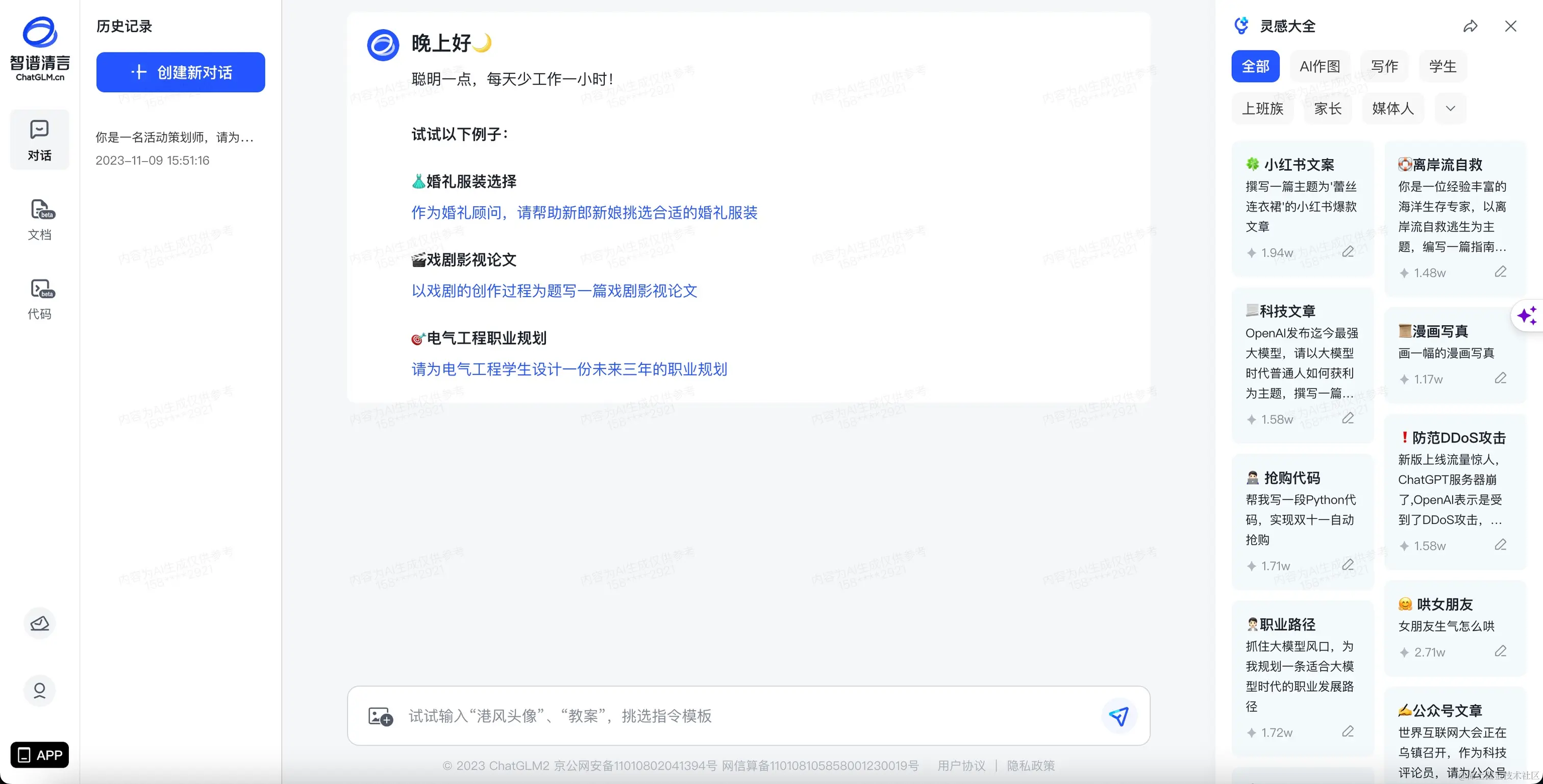 其次, 推荐 智谱清言, 免费, 地址: chatglm.cn/main/detail