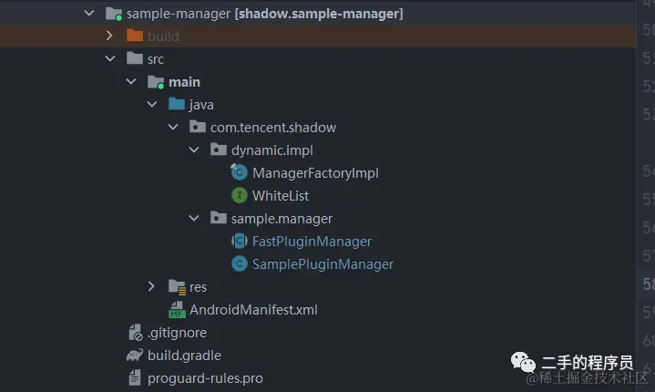 上面这个工程就是我们开发一个插件的时候,Manager 具体的实现,逻辑很简单,继承 PluginManagerThatUseDynamicLoader ,实现一个自己的 Manager就行。实际上 FastPluginManager 里面基本上也是模板代码,所以最终我们只需要实现一下 SamplePluginManager 。其核心方法是: