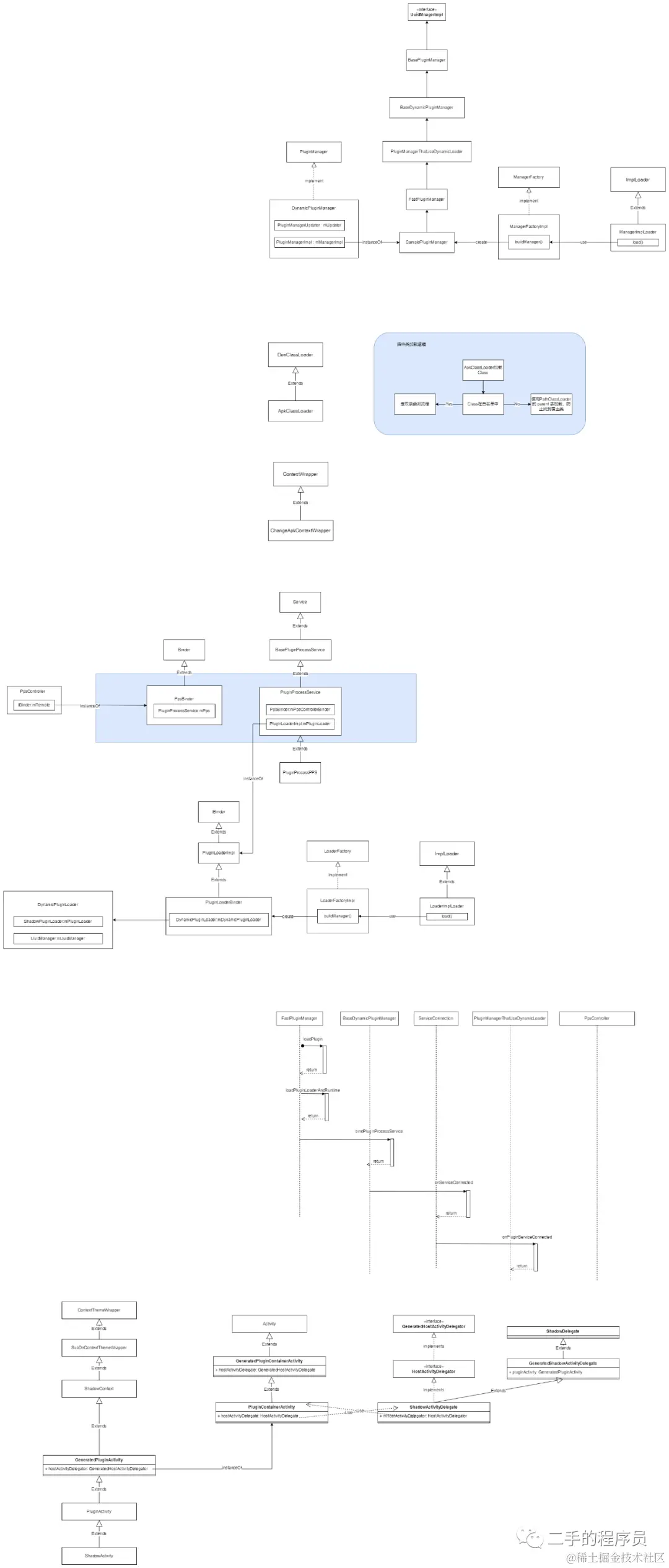 Loader就是负责加载插件Activity,然后实现插件Activity的生命周期等功能的那部分核心逻辑了。Loader 的动态化稍微蛋疼一些,虽然核心流程与Manager类似,但是由于loader与插件的依赖关系较为强烈,比如代理壳子PluginContainerActivity需要和PluginActivity通过Loader相互调用。所以Shadow应用前面提到的动态化原理时,做了双向的接口,可以看到代码中的HostActivityDelegate和HostActivityDelegator。通过定义出这两个接口,可以避免PluginContainerActivity和Loader相互加载对方时还需要加载对方所依赖的其他类。定义成接口,就只需要加载这个接口就行了。