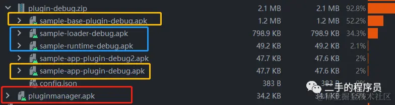 可以看到宿主有两个插件包,一个是 pluginmanager.apk,这个是属于宿主的,也可以动态更新。一个是 plugin.zip,这个就是纯插件内容,里面包含 loader/runtime,还有业务相关的 app 与 base 内容。