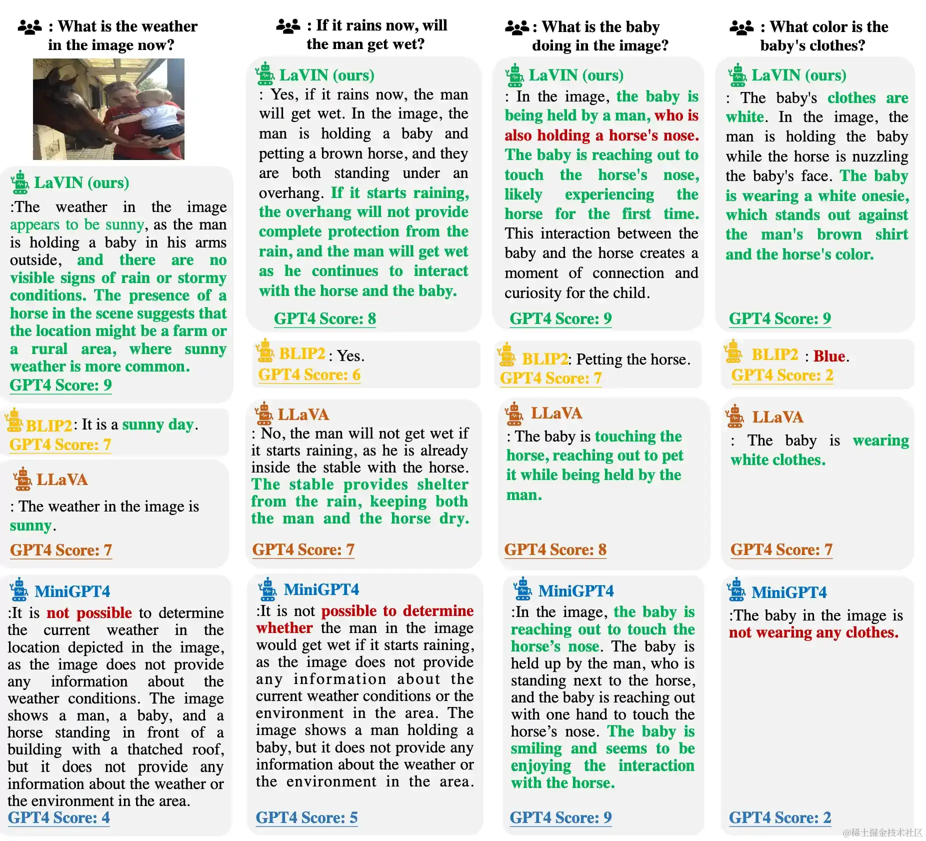 LaVIN 论文中对其输出与其他模型的对比。