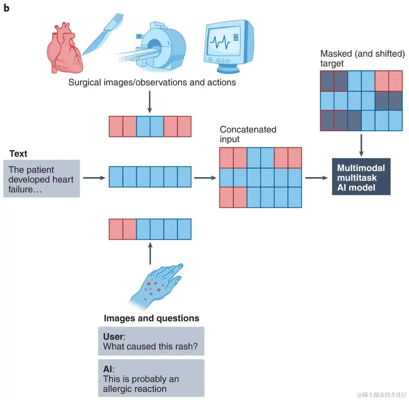 医疗领域如何运用多模态技术的例子。图片摘自:多模态生物医学人工智能研究 (Acosta 等,Nature Medicine 2022)