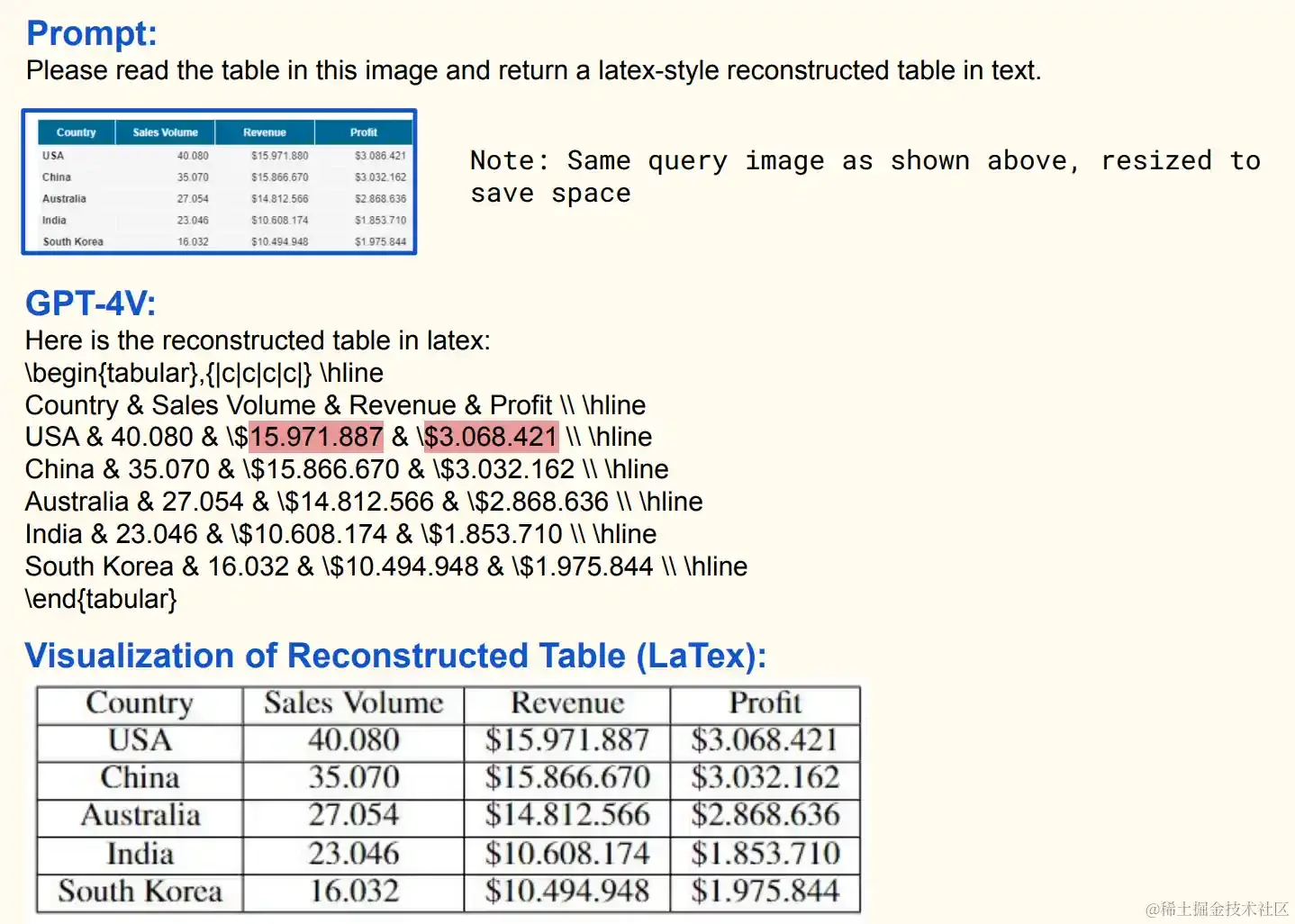 上图显示了 GPT-4V 在处理文档时的情况,其中的错误用红色标出。