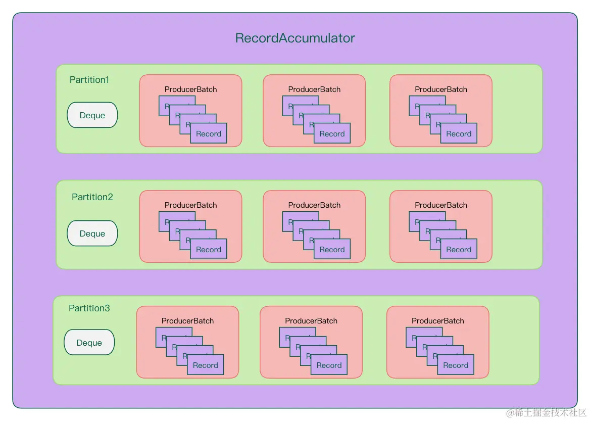 RecordAccumulator accumulator: 消息记录累积器,是消息追加的入口,通过 RecordAccumulator 的 append 方法实现。它负责将消息追加到生产者批次中。