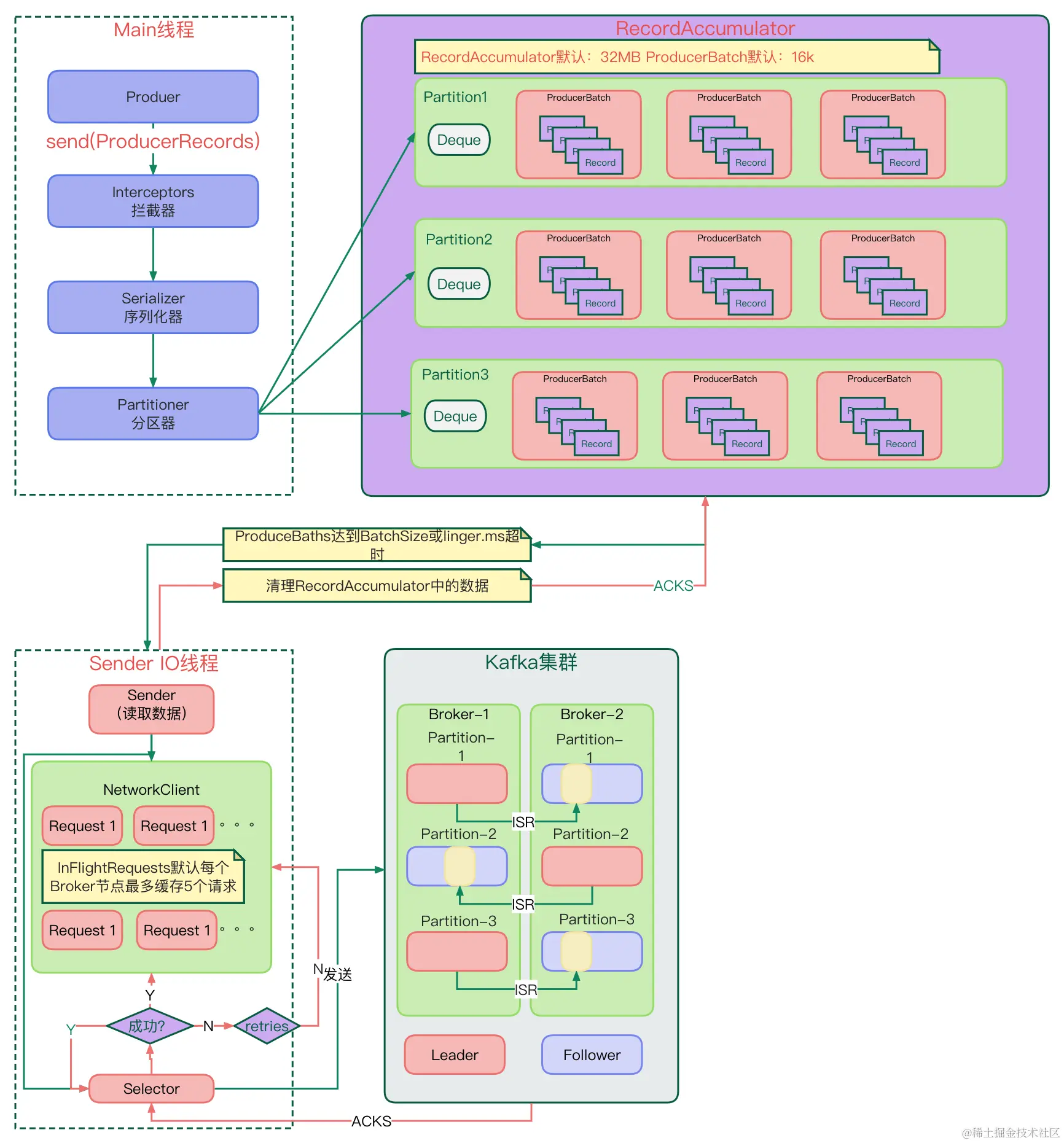 Sender IO 线程:这个线程会等待来自 RecordAccumulator 的批量数据,并将它们异步发送到 Kafka 集群。每个请求池默认缓存五个请求(max.in.flight.requests.per.connection),并等待来自服务器的 ACK(确认)。如果未收到 ACK,它会进行重试,默认重试次数上限为整数最大值(retries)。