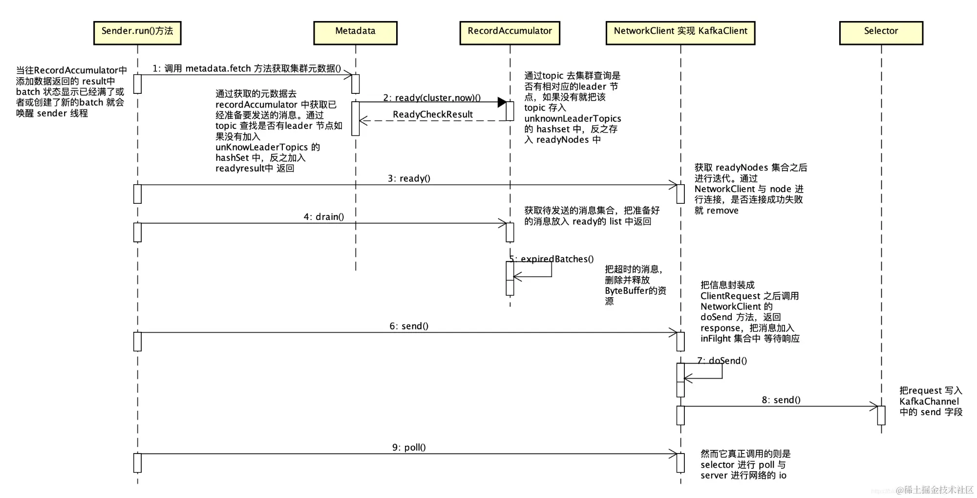 如上图所示,Kafka中Producer的消息发送过程主要涉及以下步骤,这里进行简单的阐述: