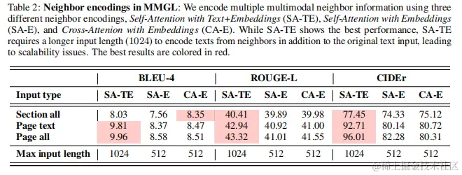 论文使用三种不同的邻域编码对多个多模态邻域信息进行编码,即使用文本+嵌入的自注意力(SA-TE)、使用嵌入的自注意力(SA-E)和使用嵌入的交叉注意力(CA-E)。SA-E和CA-E使用冻结编码器将所有模式,包括文本编码到嵌入中,而SA-TE则通过连接到输入文本序列,将文本邻域进行编码。因此,SA-TE需要更长的输入序列长度(1024)来编码额外的文本,从而导致潜在的可伸缩性问题。另一方面,SA-E和CA-E需要一个令牌长度来编码一个文本邻域,从而通过更短的输入长度提高了可伸缩性(512)。表2中的结果表明,可伸缩性与性能是权衡的:在不同输入类型时,SA-TE的性能始终优于SA-E和CA-E,但输入长度更长。