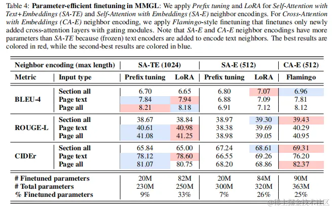 对预先训练好的LM进行完全微调需要很高的计算成本。为了实现MMGL进行参数高效微调,论文研究了文本+嵌入(SA-TE)和嵌入自注意(SA-E)邻域编码的前缀调优和LoRA。对于嵌入交叉注意(CA-E)邻域编码,论文采用flamingo风格的微调,只添加带门模块的交叉注意层。