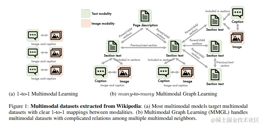 在现实世界的应用程序中有不同的数据模态,从常见的文本、图像和视频到时间序列数据或特定领域的模态,如蛋白质序列。这些不同的模态不是单独收集的,而是与它们之间的多方面的关系一起收集的。维基百科是最流行的多模态网络内容来源之一,提供多模态数据,如文本、图像和标题。Meta最近发布的网站使用每个用户的多模态数据构建个人时间线,包括他们的照片、地图、购物和音乐历史。除了这些例子之外,重要的工业和医疗决策也通过考虑多种的多模态数据,如图像、表格或音频。这些多模态数据使它们的多模态实体之间的多对多关系变得复杂——可以用图来表示——为如何全面理解它们提供了开放的研究空间。