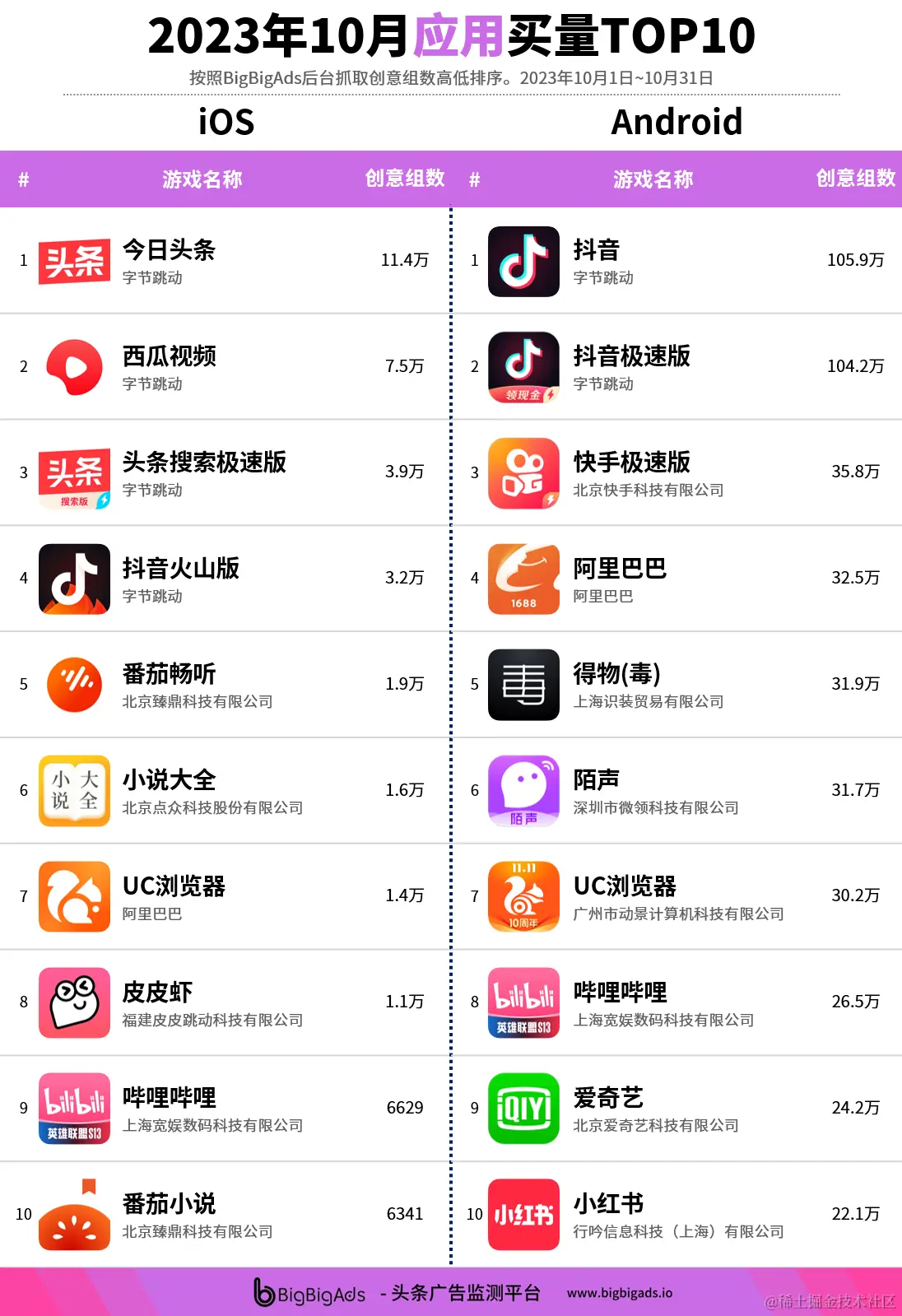盘点10月应用投放榜单,头部位置都被字节跳动旗下产品占领,其中iOS端前4和Android端前2均来自字节跳动,其中Android端【抖音】和【抖音极速版】10月创意组数都超过100万组,远超榜单第三名产品。