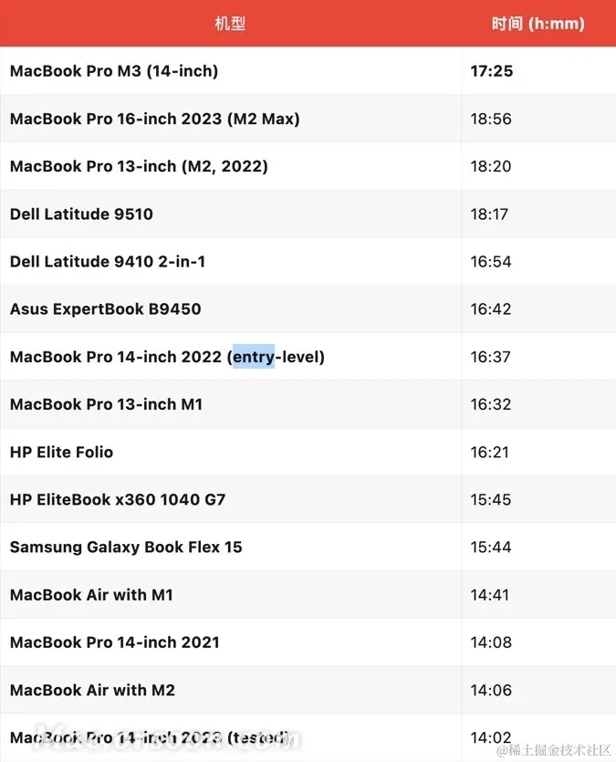这比 MacBook Pro M2 Pro 长 3 个多小时,比 15 英寸 MacBook Air 长 2 个多小时。而较小的 13 英寸 MacBook Pro M2 持续时间为 18 小时 20 分钟。