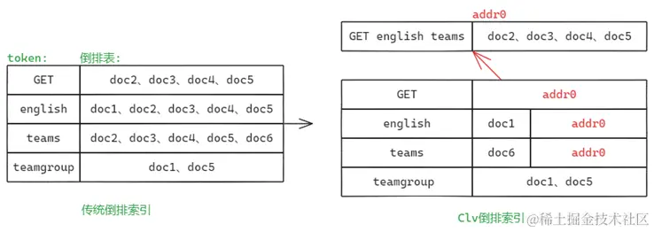 经过标准分词之后,独立的token会按照顺序进入学习型分词器进行匹配,例如学习型分词器在匹配到"GET","english","teams"等3个单词经常出现在一起的概率很高,那么就会为这"GET","english","teams"3个单词建立一条倒排表记录。倒排表如下图示例(倒排表中docX表示不同的文本数据行):