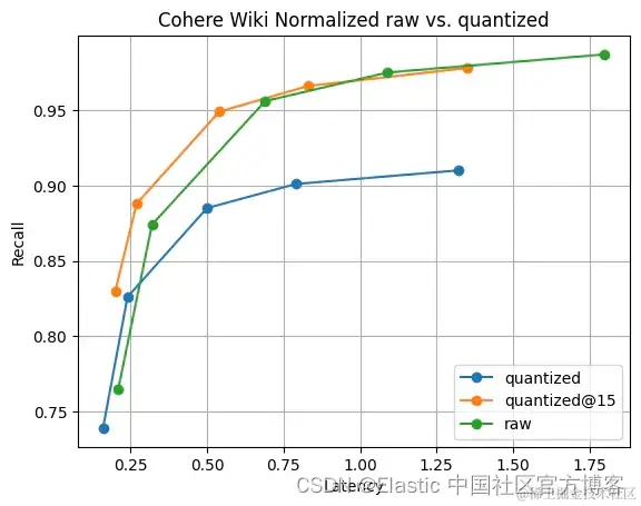 图 6:量化向量与原始向量的 Recall@10。 量化向量的搜索性能明显快于原始向量,并且只需多收集 5 个向量即可快速恢复召回率; 由 quantized@15 可见