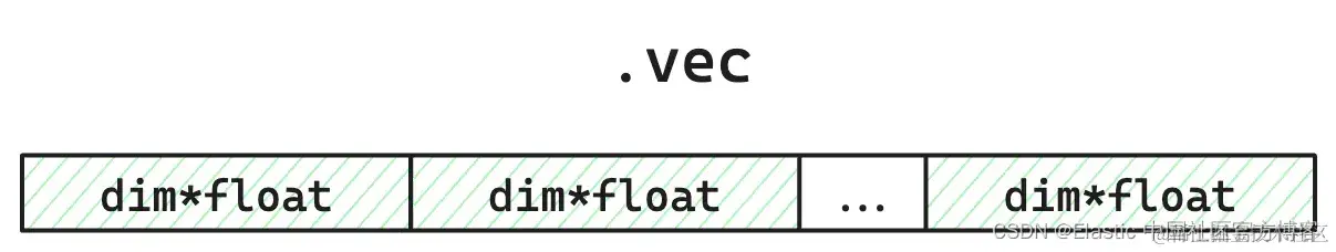 图 2:.veq 文件的简化布局。 占用 (dimension+4)*numVectors 空间,在搜索时会被加载到内存中。 +4 字节用于考虑修正乘数浮点数,用于调整评分以获得更好的准确性和召回率。